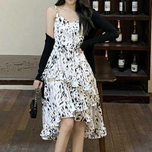 프리미엄 로맨틱 러플 플레어실루엣 서스펜더드레스