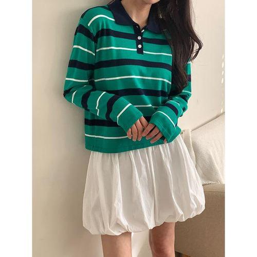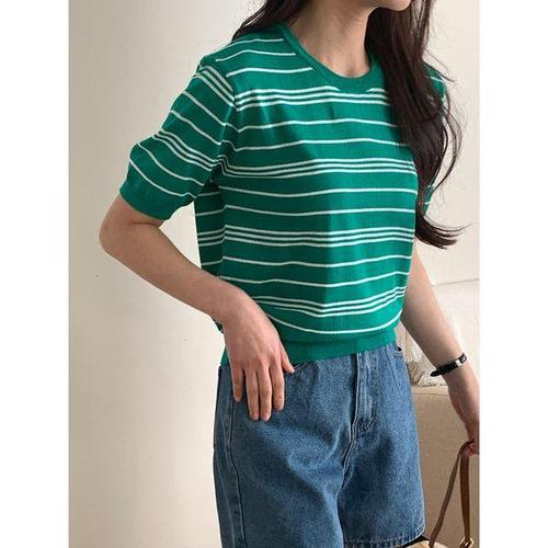 [샵앤]국산 여성 라운드넥 단가라 면사 100 반팔 니트 티셔츠 21DS-WKN-4386-그린