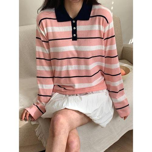 [샵앤]국산 여성 반오픈 카라넥 단가라 면사 100 니트 티셔츠 21DS-WKN-4388-핑크