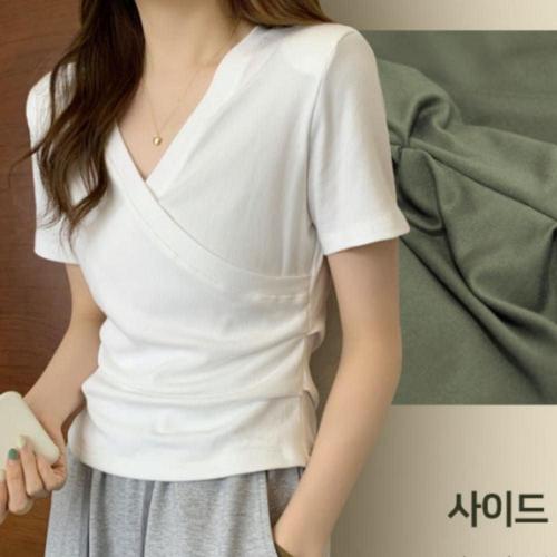 여자 무지 티셔츠 브이넥 면 셔링 기본 모달 반팔티