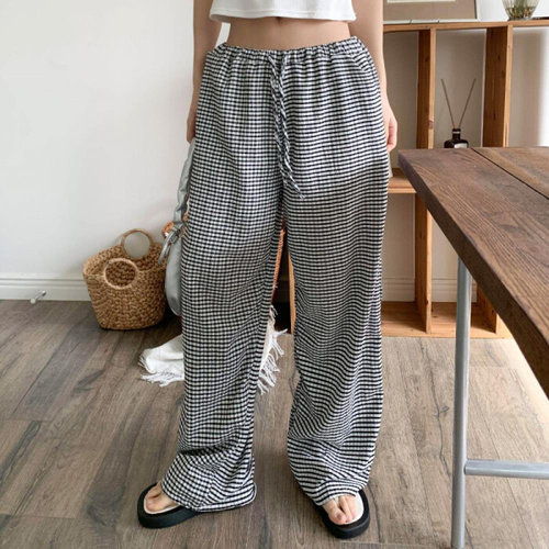 옷자락 / 여자 면100 잔잔체크 스트링 밴딩 와이드 롱 팬츠