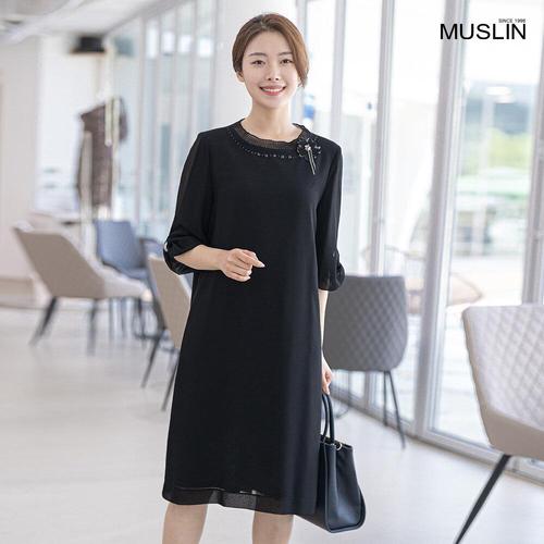 [모슬린]엄마옷 라운드 레이어드 브로치 원피스 614FGH383 마담/중년여성/빅사이즈/50대/60대