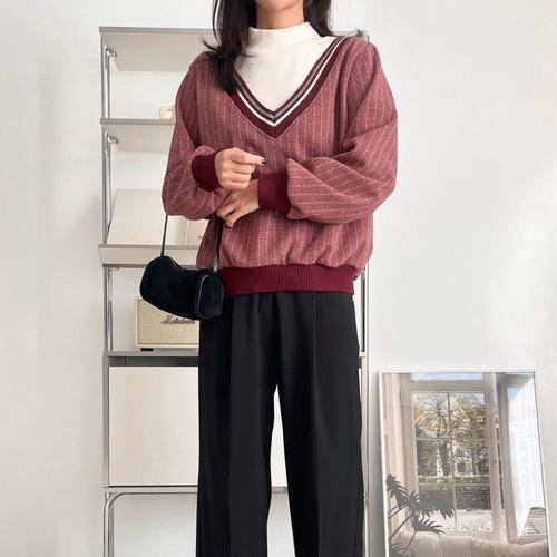 |KSTA0AC|여성 브이넥 폴라 티셔츠 레이어드 스트라이프 디자인