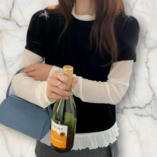 |CCTA2F6|여성 벨벳 프릴 레이어드 시스루 터틀넥 티셔츠