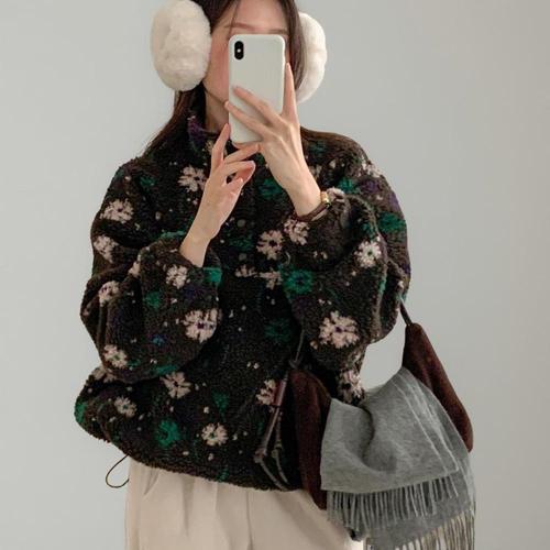 |CST9F4C|여성 플라워 버튼 하이넥 스트링 뽀글이 후리스 맨투맨