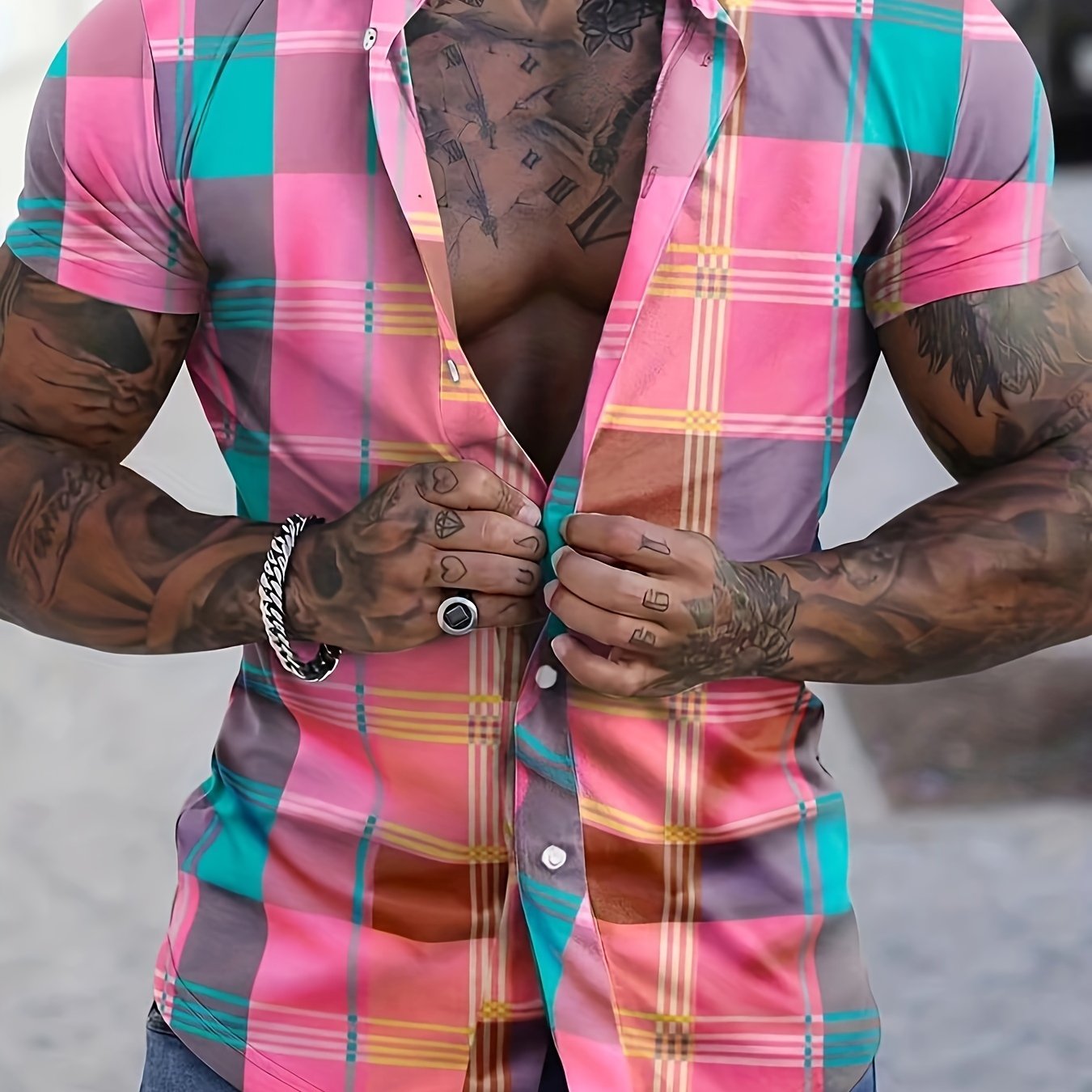 TEMU 남성용 봄 여름 가을 체크 캐주얼 편안한 반팔 레귤러핏 셔츠, 휴가 및 캐주얼 외출용, 100% 폴리에스터, 세탁기 사용 가능, 드라이클리닝 불가. CY204