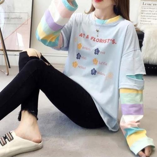 T셔츠용 여성 긴소매 오버사이즈 루즈 하라주쿠 레인보우 스트라이프 튜닉 상의