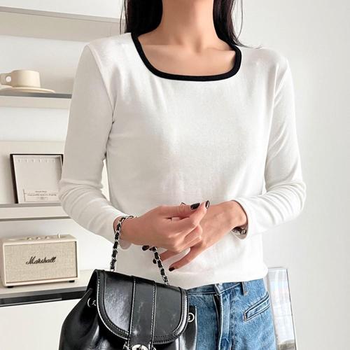 |KSTA08B|여성 스퀘어넥 배색 세미크롭 긴팔 티셔츠 데일리 무지