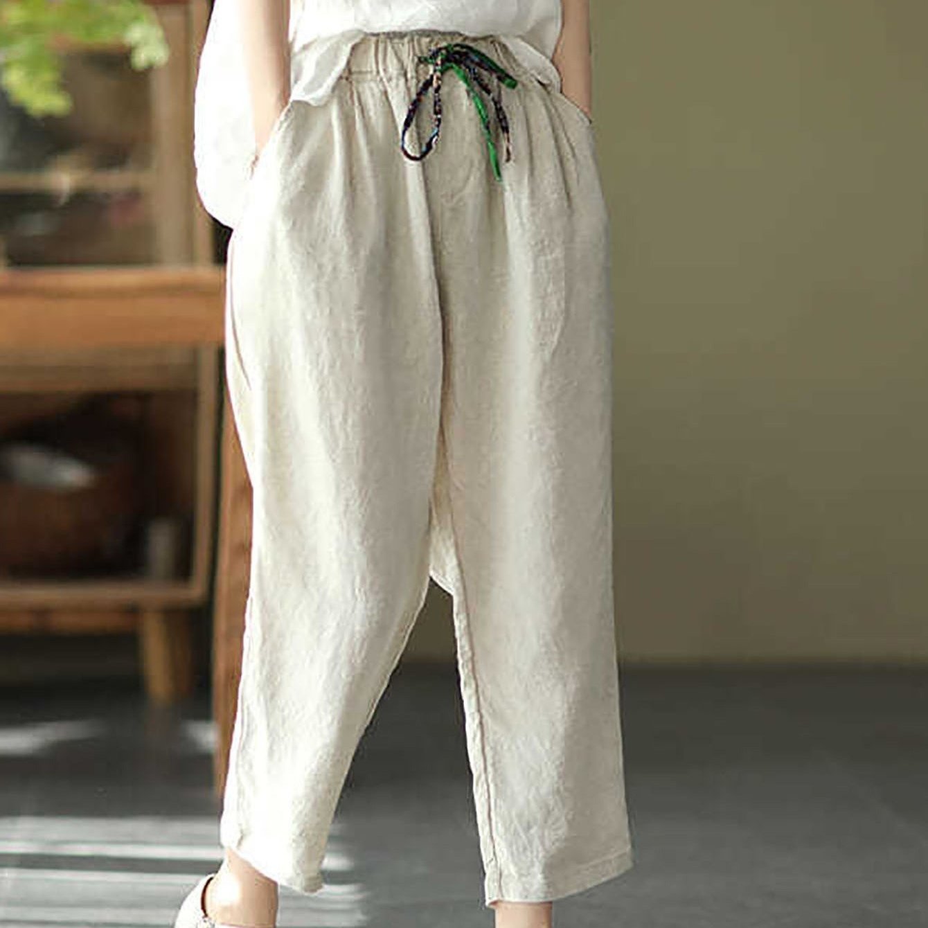 TEMU 여성용 여름 9부바지 밴딩 슬랙스 캐주얼 바지 데일리 빈티지 스트링 배기 팬츠 편한바지 면