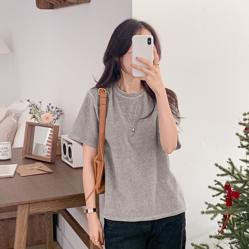 플러리싱 / 겨울 무지 벨로아 라운드넥 반팔티 플러리싱
