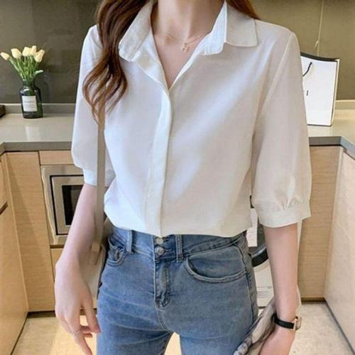 [에이치플러스몰]5부 여성 캐주얼 퍼프소매 무지 필수템 쉬폰셔츠 상의
