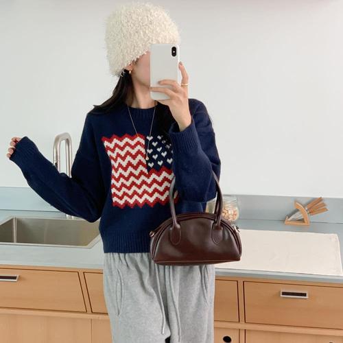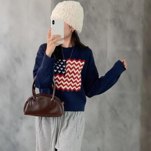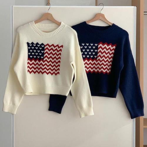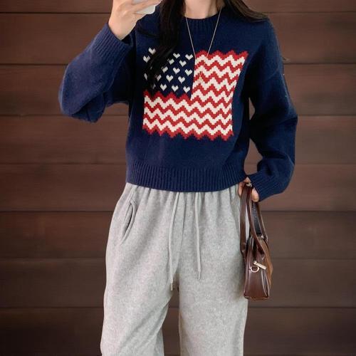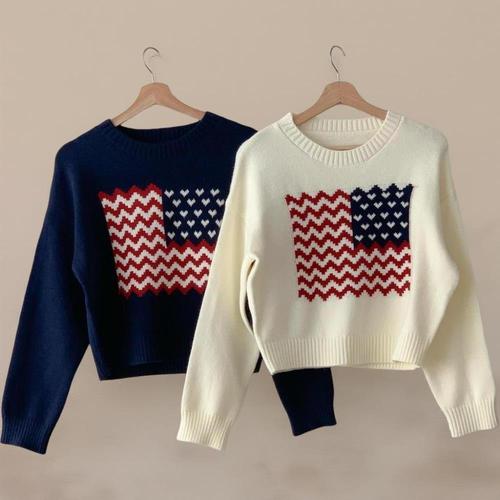 [옷자락]여성 하트 물결 패턴 성조기 크롭 라운드넥 가을 겨울 니트