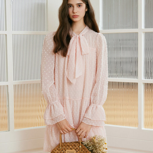 트위디아 / 로아스 리본 타이 캉캉 셔링 미니원피스 핑크