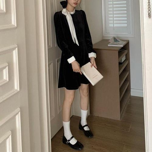 besteffie 원피스 봄 가을 스퀘어넥 슬림핏 A라인 벨벳원피스 우아한 패션 빅사이즈 여성미니원피스 C15
