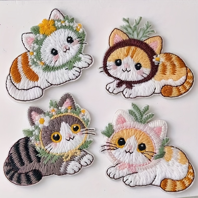 TEMU 고품질 귀여운 고양이 4개 세트, 자가 접착 고양이 자수 패치 - 바느질 필요 없는 자수 패치 - 고밀도 자수 패치 - 만화 동물 자수 패치 - 사실적인 자수 패치 - 의류 장식에 매우 적합, 스카프, 모자, 가방, 휴대폰 케이스 DIY 장식용 액세서리로 사용 가능
