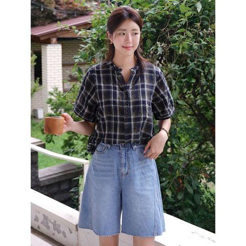 [드리다]여성 여름 린넨 면 체크 반팔 반오픈 셔츠 남방 블라우스 40-50대 미시 중년여성 엄마옷 캐주얼