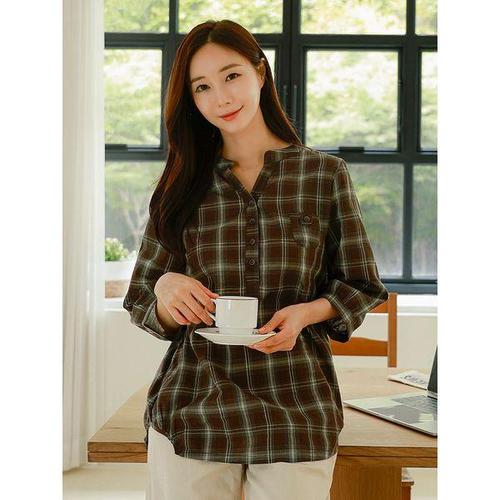 [드리다]여성 봄 여름 깅엄 체크 빅사이즈 7부 면 남방 셔츠 블라우스 40-50대 미시 중년여성 엄마옷