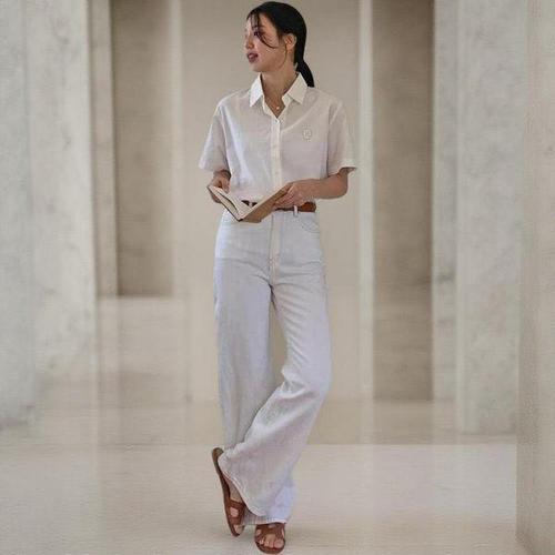 [다잇템]여성 반소매 H라인 미니멀리즘 코튼 셔츠