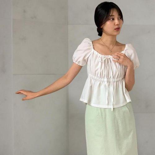 옷자락 / 여성 러블리 스퀘어넥 면 셔링 배색 반팔 블라우스
