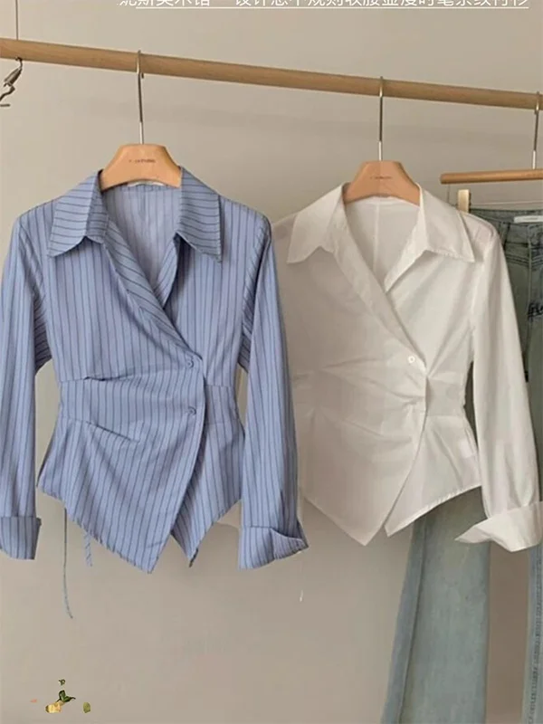 슬리밍 스트라이프 긴팔 셔츠 여성용 봄 패션 폴로 칼라 비정형 디자인 출퇴근 스타일 한국 버전 얇은 모델