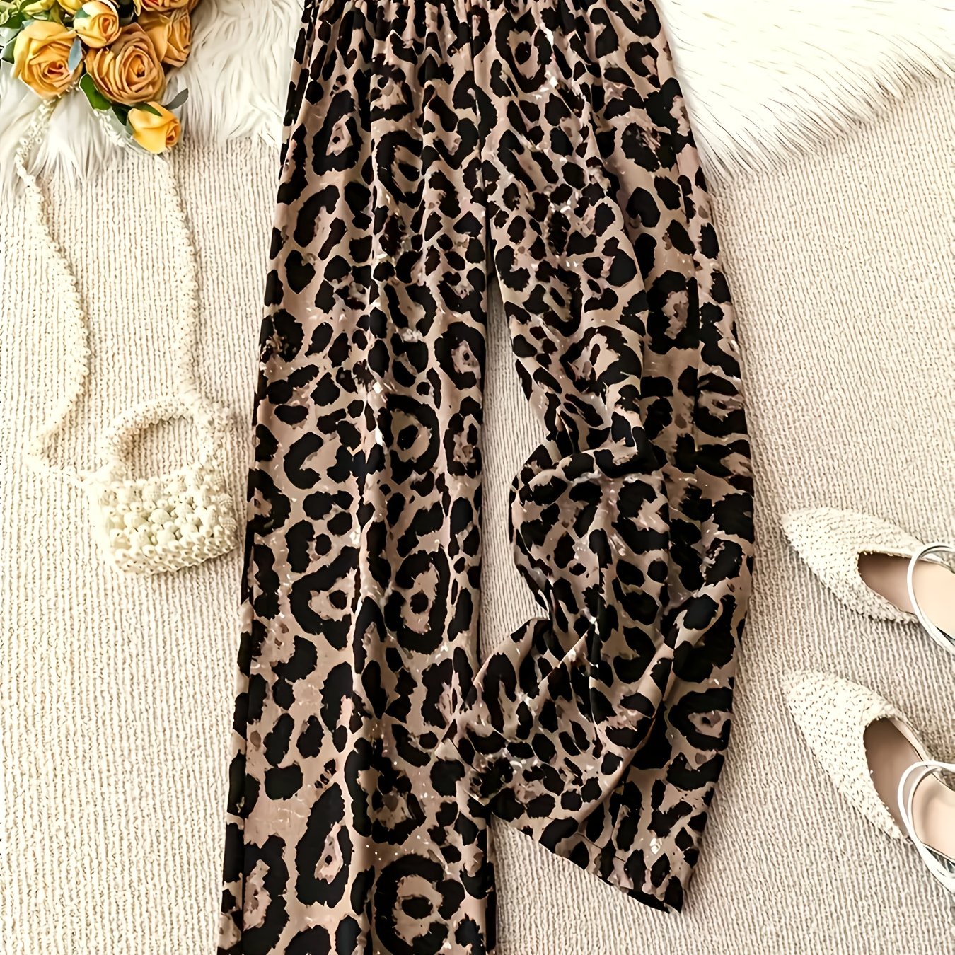 TEMU 여성용 우아한 와이드 프린트 맥시 팬츠 - 탄력성 허리밴드, 루즈핏 바지, 사계절 착용, 캐주얼 & 드레시 스타일, 논스트레치 (착용 불가)