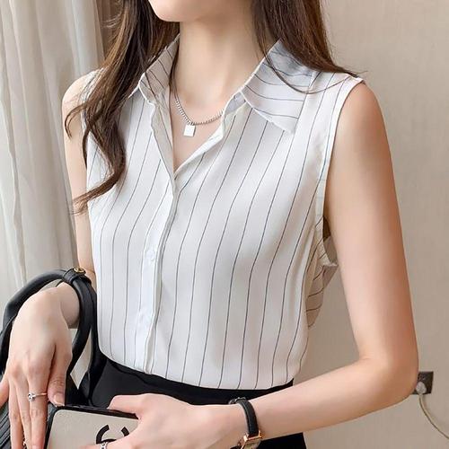 여성 민소매 스트라이프 카라 셔츠 블라우스 오피스룩 (WFHVSQ8)