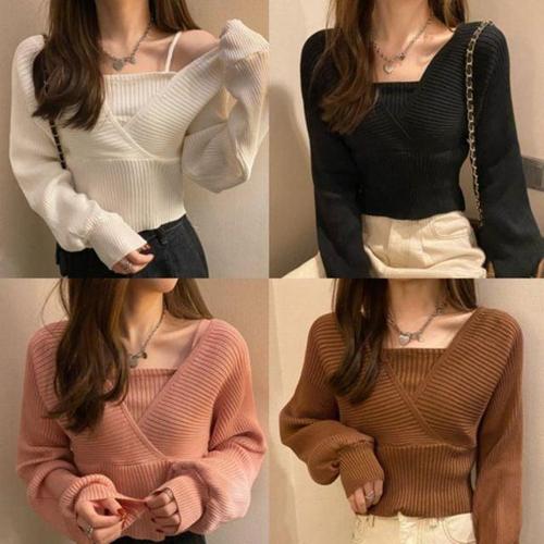 우먼 랩 스퀘어민소매 스탠다드 레이어링 일체형 장팔 뜨개탑