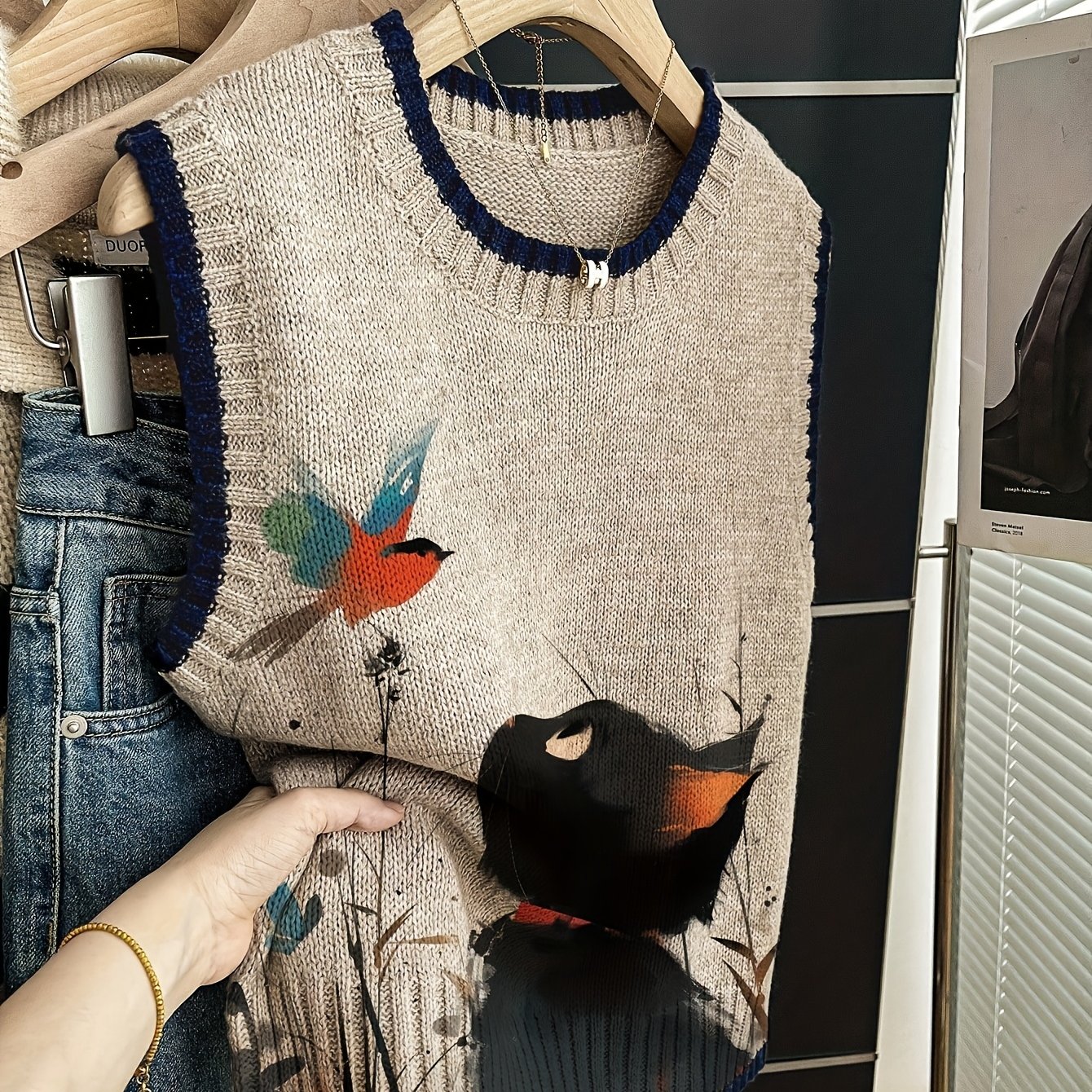 TEMU 여성용 민소매 스웨터 조끼 자켓 - 고양이 & 새 프린트 칼라 & 트림, 네이비, 루즈핏 라운드넥 코트, 가을 겨울용, 손세탁 가능한 우아한 아우터웨어