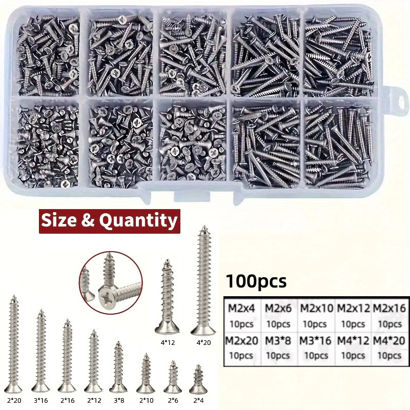 TEMU 100/620개 자가탐침 나사 세트: M2-M4 사이즈, 목재 무늬 스레드, 금속용, DIY 및 가정 수리용