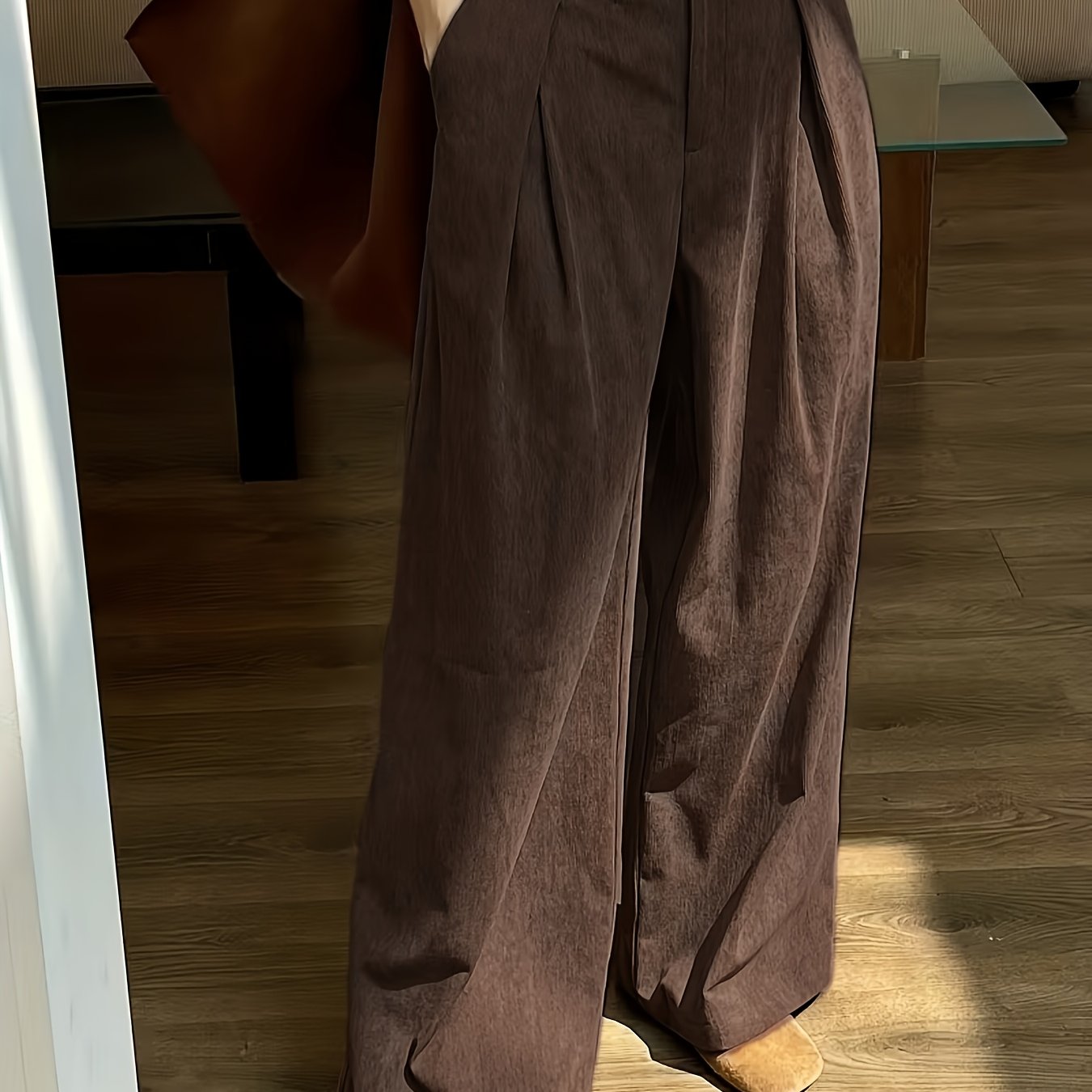 TEMU 여성용 코듀로이 와이드 팬츠 - 풀 길이 내장 지퍼 클로저, 캐주얼 엘레강스 웨어, 봄/가을 아웃핏, 루즈핏 (기계 세탁 가능) 솔리드 컬러 홈 & 커뮤트용 팬츠