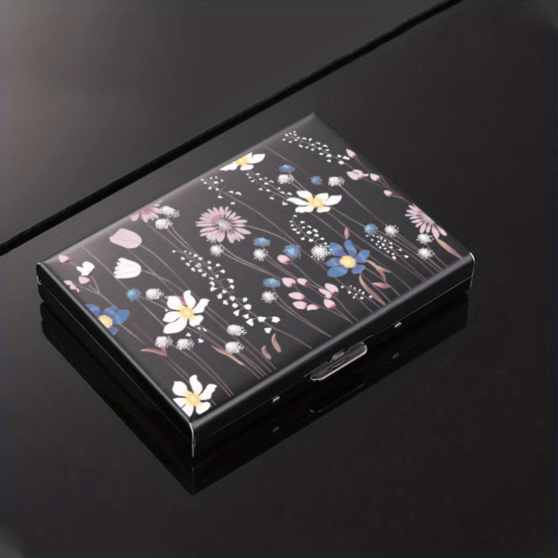TEMU OBCREATOR 스테인리스 스틸 카드 홀더, 꽃무늬 프린트, 남녀 공용 디자인, 검은색 금속 지갑, 안전한 버클 클로저, 내구성 및 세련된 일상 사용, 안전한 카드 보관 | 꽃무늬 카드 홀더 | 내구성 지갑