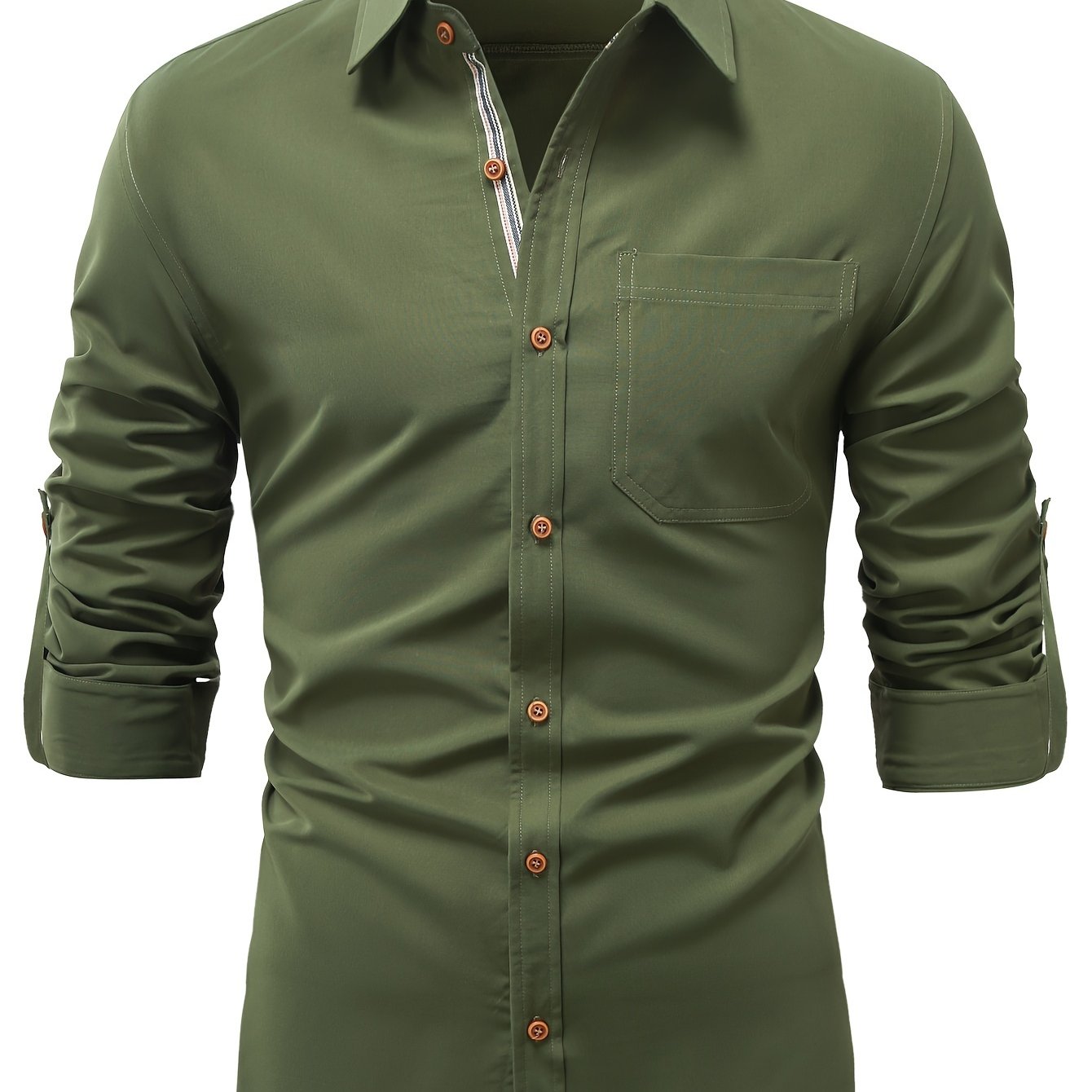 TEMU 남성용 클래식 그린 캐주얼 드레스 셔츠 - 100% 폴리에스테르, 신축성 없음, 기계 세탁 가능, 가슴 포켓, 롤업 소매 & 지퍼 디테일, 사계절용 편안함