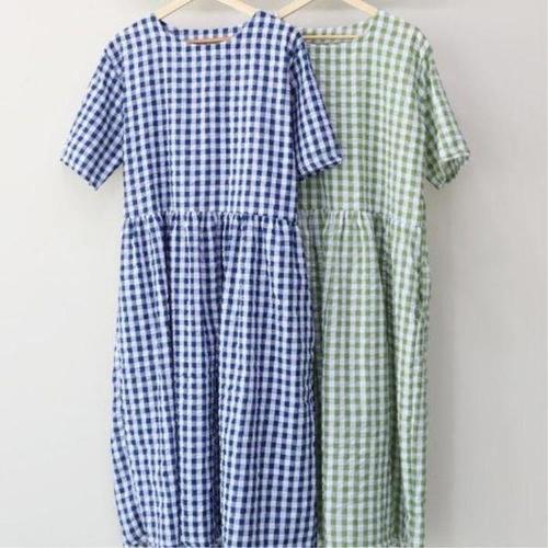 [다잇템_패션]여성 반소매 롱 미니멀리즘 면혼방 격자 원피스