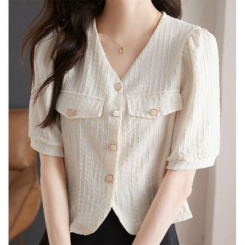 [에이치플러스몰]여름 브이넥 데일리 여자 브라우스 클래식 여성 반팔