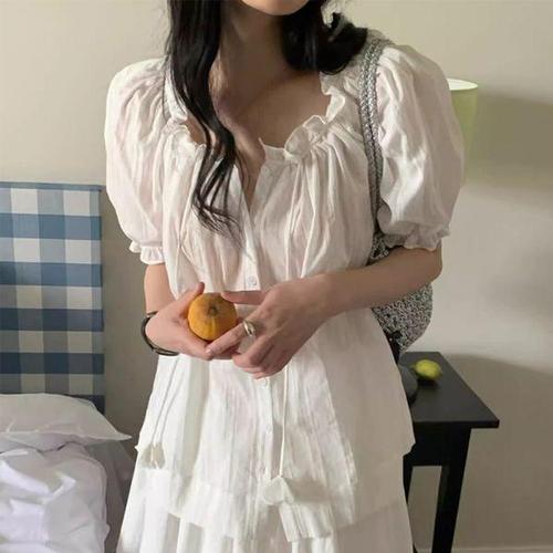 [에이치플러스몰]볼륨퍼프 데일리 베이직 러블리 여름 반팔티 블라우스