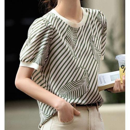 [패션시그널]사선줄지 라운드넥 반팔 블라우스 386F42