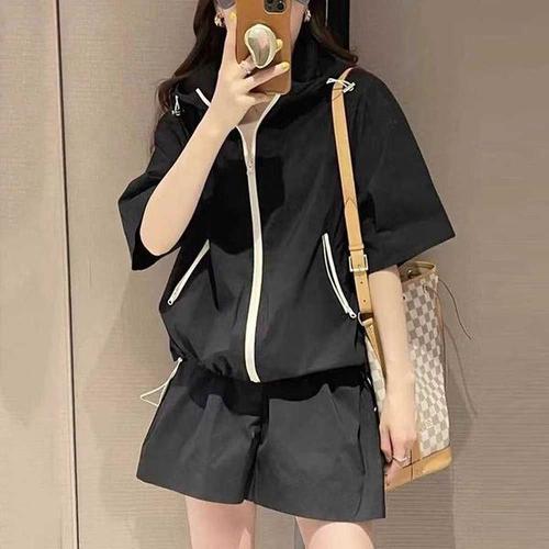 [에이치플러스몰]배색 반팔 후드 집업 밴딩팬츠 투피스 세트 편한코디