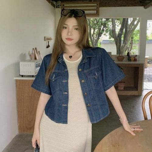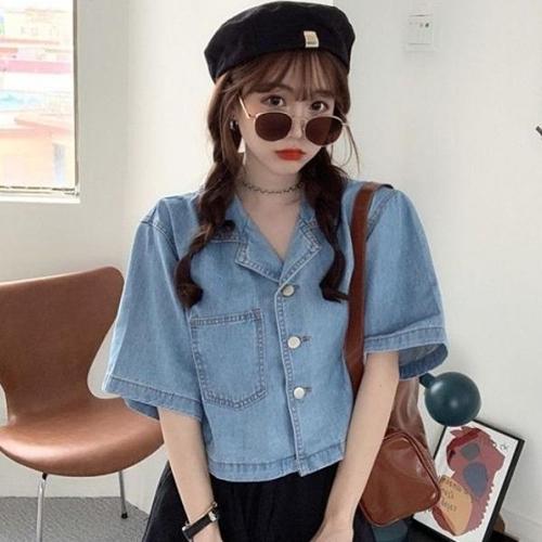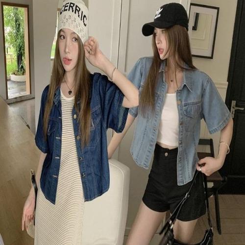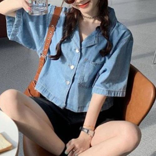 여성용 여름 캐주얼 반팔 데님 셔츠 루즈핏 숏 청자켓