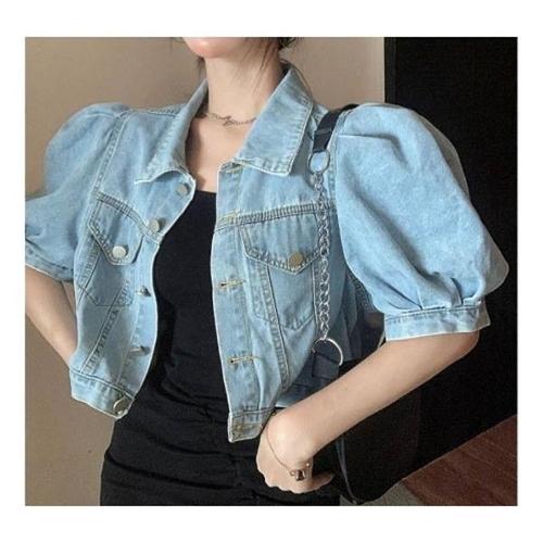 여성 여름 반팔 벌룬소매 데님 숏자켓 카라청크롭자켓