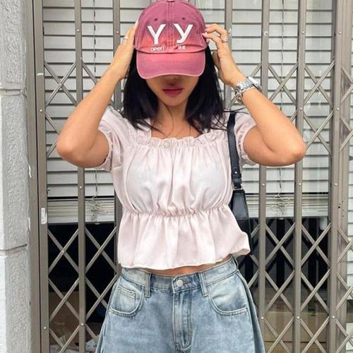 [다잇템]여자 스퀘어넥 반소매 잔주름 프릴 블라우스