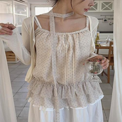 [엘루이즈][엘루이즈] [3set/발레코어] 루브링 티어드 프릴 도트 나시 초커 가디건 세트(2color)