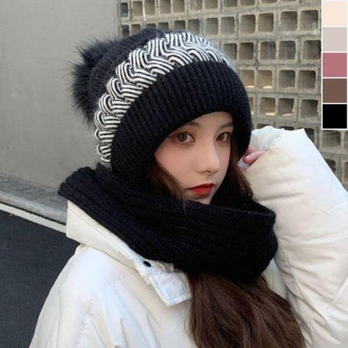 [에이치플러스몰]여성 방울 니트 모자 목도리 1P 겨울 비니 털모자