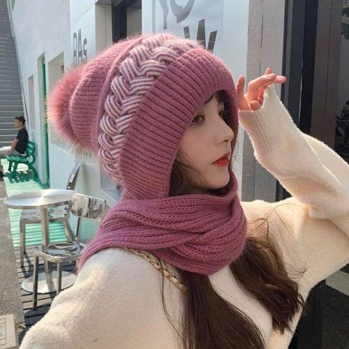 [BZJKVXH2_4A]겨울 방울 니트 일체형 모자 머플러 목도리