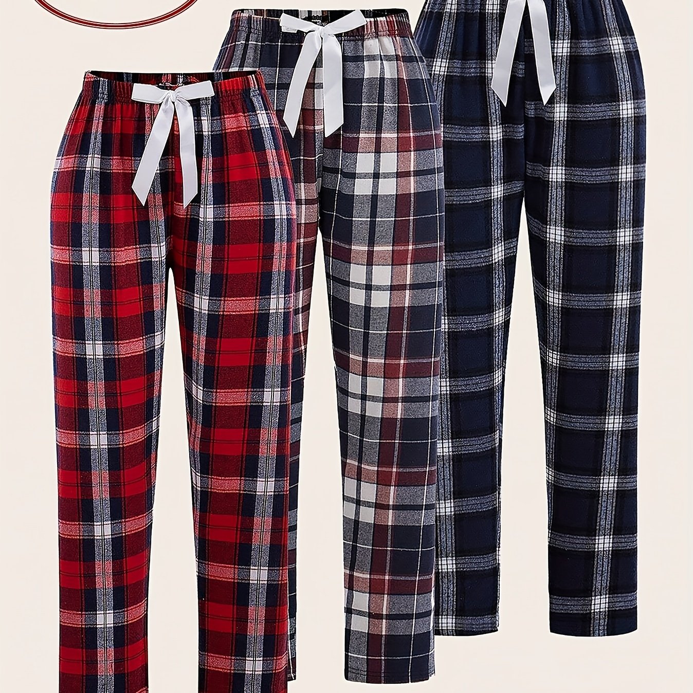 TEMU 여성용 3피스 체크무늬 슬립 팬츠 세트, 리본 타이 허리밴드 - 편안하고 루즈핏, 신축성 있는 허리, 세탁기 사용 가능