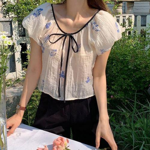 [옷자락]여자 자수 시스루 셔링 벌룬 배색리본 크롭 블라우스