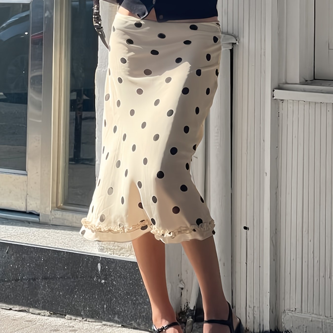 TEMU 여성용 우아한 물방울 무늬 스커트 - 러플 엣지 플레어 밑단, 가볍고 여름에 적합한 스커트, 데일리 & 포멀룩, 오피스, 파티, 캐주얼 웨어 - 우아한 여성 의류, 오피스룩, 플로리드 원단, 패션 애호가