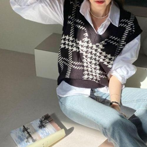 [엄지척]체크 V넥 윈터 니트 루즈핏 따뜻 베스트 여성 겨울베_20360341_667501