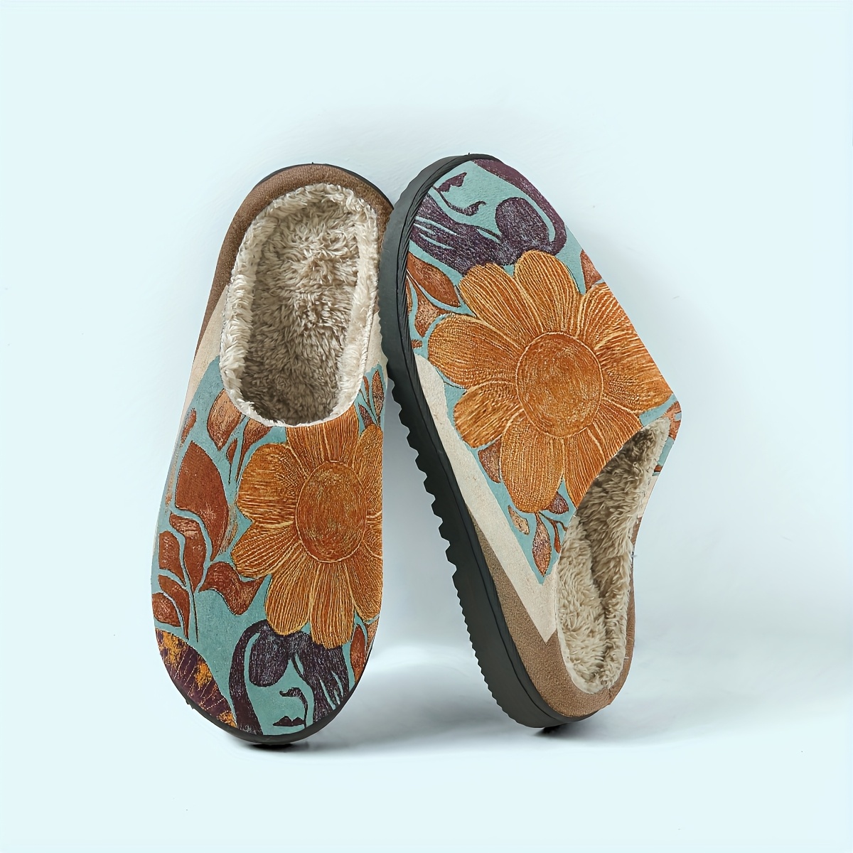 TEMU 1쌍 플로랄 슬리퍼 - 여성용 편안한 플러시 벨벳 실내외 슬리퍼, 생동감 있는 오렌지 & 블루 디자인의 따뜻한 홈 슈즈, 완벽한 휴일, 생일 또는 할로윈 선물, 실내 슬리퍼 | 스타일 | 플러시 벨벳 슬리퍼, 실내 사용을 위한 슬리퍼