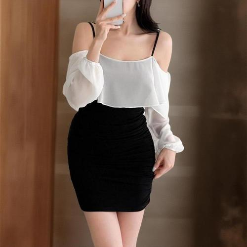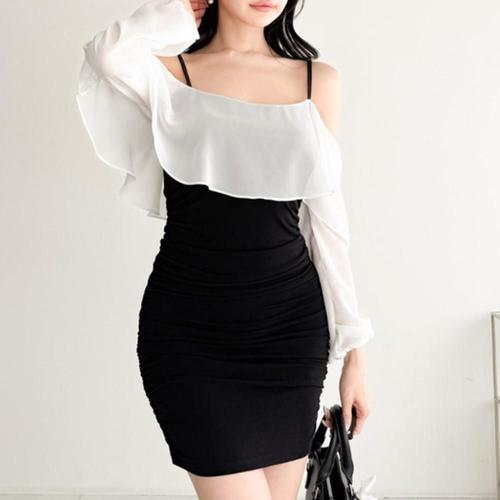 [신상오픈런]여성 오프숄더 미니 원피스 쉬폰 배색 셔링 스타일