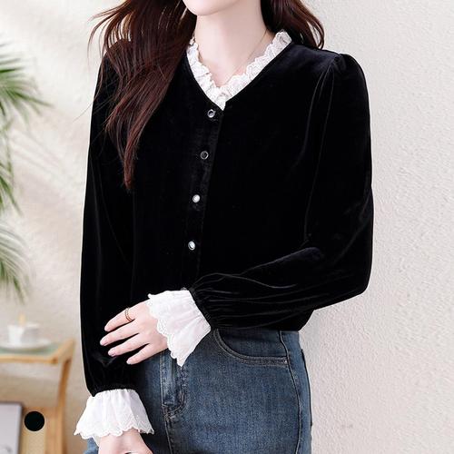 프렌치 스타일 블랙 셔츠 우아한 레이스 패치워크 벨벳 여성 블라우스 초봄 신상 슬림핏 긴팔 탑